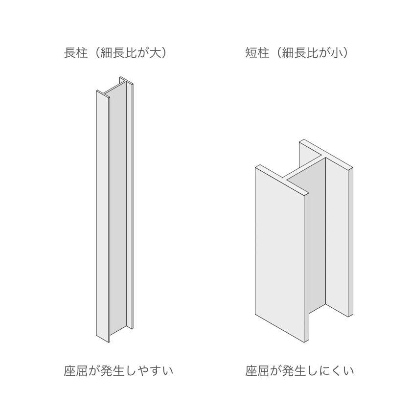 図のとおり、長柱(細長比が大)とでは、座屈の起こりやすさがイメージしやすいでしょう。